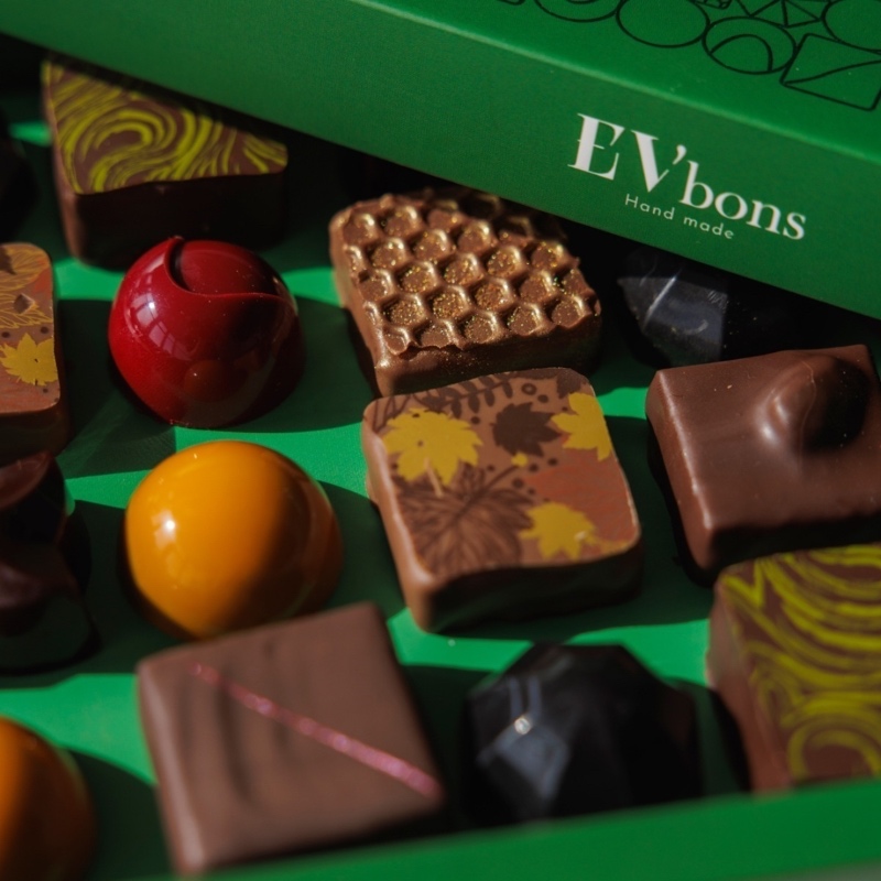 EV’bons Кутия шоколад – 27 бонбона Изискан подаръчен комплект, съдържащ по три броя от всички 9 вида бонбони EV’bons. Всяко вкусово изкушение е майсторски създадено – от плодови нотки до кремообразни ядкови пълнежи и фин шоколад. Подходяща за споделяне, празници или когато искате да поднесете нещо по-специално.