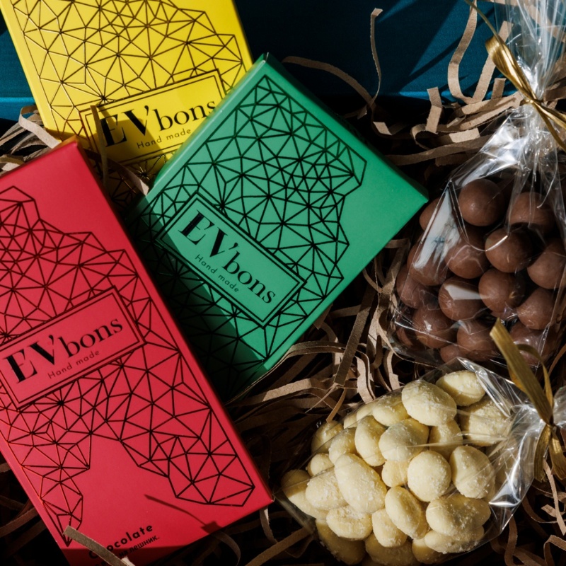 EV’bons Подаръчна кутия Стилно поднесена селекция от изискани вкусове, създадена като перфектен подарък за любим човек или специален повод. Всяка подаръчна кутия включва три вида шоколади – с лешник, фъстък и шамфъстък – както и две пакетчета дражета: бял шоколад с кокос и млечен шоколад с лешник. Всички продукти са без добавена захар, подсладени с еритритол, а белият шоколад – с еритритол и малтитол. Подарък, който впечатлява още при отварянето.